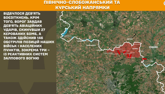 На Північно-Слобожанському і Курському напрямках минулої доби відбулося дев’ять боєзіткнень. Крім того, ворог завдав 9 авіаційних ударів, скинувши 27 керованих бомб, а також здійснив 146 обстрілів позицій наших військ і населених пунктів, зокрема три – із реактивних систем залпового вогню.