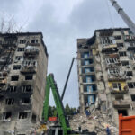 Внаслідок влучання ракети Х-101 у Солом’янському районі Києва обвалився цілий підʼїзд 9-поверхівки, а у пʼятиповерхівці почалась пожежа.